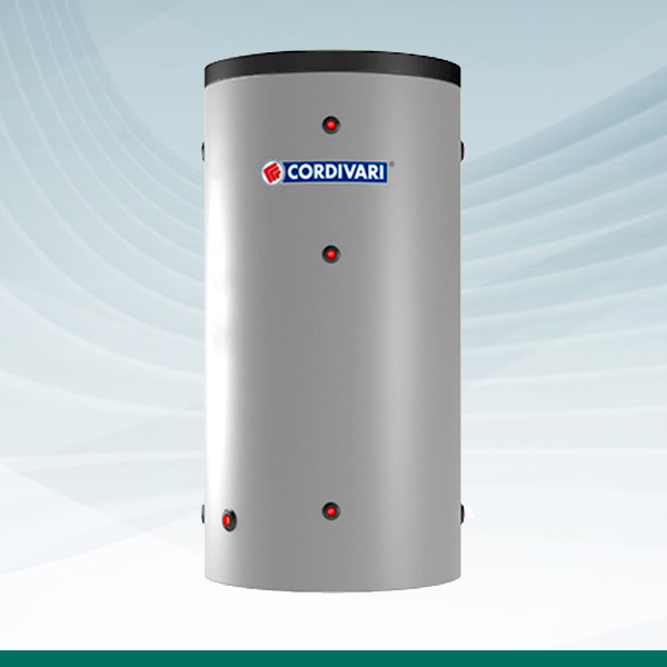 Depósito de inercia para almacenamiento de agua caliente o fría procedente de la bomba de calor, con la función de limitar el número de encendidos y apagados de dicha bomba cuando se producen rápidas variaciones de temperatura.