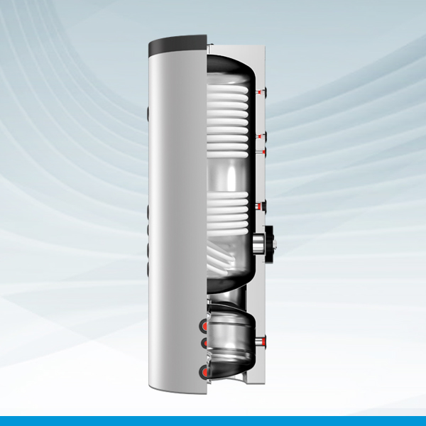 La gran superficie de intercambio del modelo DUPLO2C permite alta eficiencia en la transmisión de calor a baja temperatura lo que lo hace adecuado para su empleo con bombas de calor. El segundo serpentín permite combinar una fuente de calor adicional a la bomba de calor que en el modelo DUPLO2C está optimizado para caldera. El depósito de inercia de la parte inferior permite almacenar energía térmica de calentamiento, reduciendo el número de puestas en marcha de la bomba de calor.