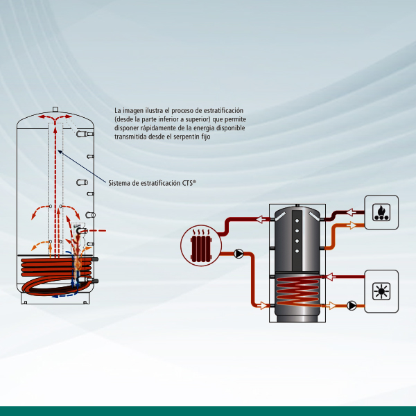 Estos depósitos se han diseñado para mejorar la flexibilidad de sistemas con fuentes de calor discontinuas y de baja temperatura, mediante el sistema de estratificación CTS®.