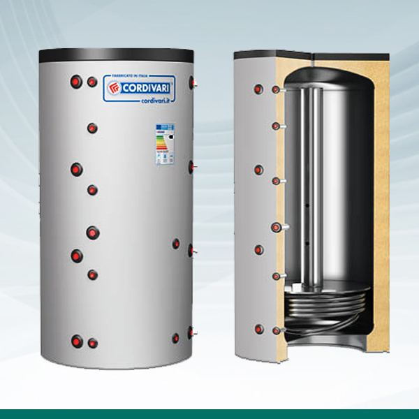Los depósitos de inercia Suicalsa PF2E estratificados están fabricados en acero carbono pintados exteriormente y disponen de un serpentín fijo de acero carbono con sistema de estratificación CTS® .